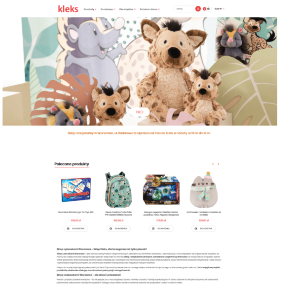 Wachlarz produktów jest naprawdę niemały, co znaczy, że nikt nie powinien mieć kłopotu z odnalezieniem czegoś dla siebie. Sklep prosperuje też stacjonarnie, a więc opiekunowie z dziećmi mają możliwość do niego skierować się wtedy, kiedy tylko będą mieć na to chęć i spodziewać się, że zostaną obsługiwani na bardzo wysokim poziomie. Kleks znany jest z tego, że w sklepie stacjonarnym działa wyjątkowo kameralny punkt zabaw dla maluchów. Jest to miejsce przyjemne, jakie motywuje wręcz do następnych odwiedzin. Najważniejsze podkategorie, w obrębie jakich można robić zakupy to: Do szkoły, Do zabawy, Dla artystów oraz Dla biura i domu. W każdej z tych kategorii znajduje się wyjątkowo sporo wyrobów. Przeznaczane są one na równi dla najmłodszych, dzieci starszych, ale też dla dorosłych. Od markowych zabawek, przez artykuły szkolne, do biura, lub do wykonywania prac kreatywnych, można oczekiwać, że odnajdzie się wyroby z certyfikacją, atestowane oraz te, jakie będą w 100% pobudzały kreatwyne podejście. W kleksie odrębną kategorią są zabawki, jakie nie tylko służą zabawie, ale także pomagają rozwijać wyobraźnię a także uczą tego co dzieje się wokół.